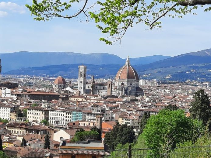 Po zwiedzaniu Triestu nastąpiła Wenecja a potem pobyt kilkudniowy we Florencji. Ponowne zwiedzanie wielkich sławnych muzeów. Po to tu przyjechaliśmy przecież! Po koniecznym kupieniu biletów nowocześnie online, ustawiam się w kolejce z biletem w dłoni przed „Uffizi”, głównym adresem wielbicieli sztuki tu nad Arno. A jednak, mimo online, trzeba stać! Stoimy jeszcze pod podcieniami, z dwustu turystami przed i trzystu za nami na zewnątrz budynku. Powoli posuwamy się. Na szczęście ciepło. Wreszcie jesteśmy przy wytęsknionych drzwiach po 40 minutach stojąc i posuwając się w kierunku wejścia.