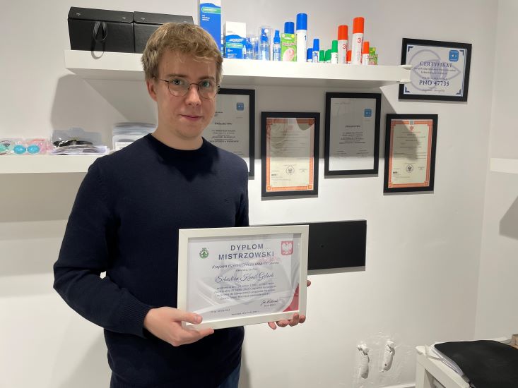 Sebastian: – Jeszcze raz dziękuję. Nie ukrywam, iż jestem bardzo zadowolony z tego, że zawodowo jestem tu, gdzie jestem. Nie spocząłem jednak na laurach, gdyż na początku 2023 r. zdałem egzamin organizowany przez Krajową Rzemieślniczą Izbę Optyczną i uzyskałem tytuł mistrza w zawodzie „optyk okularowy”. Pomyślne zdanie egzaminu i zdobycie tego tytułu było wówczas ukoronowaniem mojej dotychczasowej nauki i pracy w tym zawodzie.