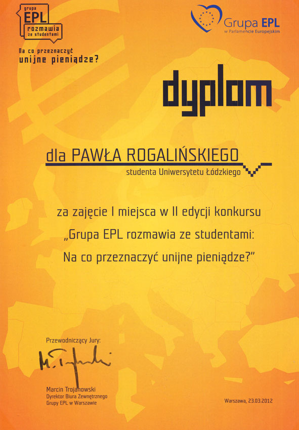 Tuż obok przedstawiam dyplom z rozdania nagród (ja zdobyłem I miejsce) Europejskiej Partii Ludowe w Warszawie (23.03.2012). Zdjęcia z tego wydarzenia można zobaczyć w dziale "Galeria", do czego serdecznie zachęcam! http://www.przegladdziennikarski.pl/galeria-2/