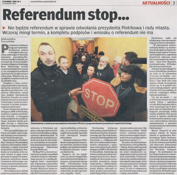 Zbiórka podpisów pod referendum ws. odwołania prezydenta miasta Piotrkowa Trybunalskiego Krzysztofa Chojniaka nie powiodła się, głównie z winy urzędniczej. To rodzi poważne pytanie o jakość demokracji w Polsce i Europie. Łódzki oddział Stowarzyszenia Demokratycznego, który poparł Piotrkowską Inicjatywę Obywatelską, chciałby tym samym wyrazić swój stanowczy sprzeciw podobnym praktykom. Tuż obok zamieszczam skan artykułu z „Dziennika Łódzkiego” (kliknij: http://krogalinskidbox.dbox.pl/wp-content/uploads/2013/04/Dziennik-Lodzki-Referendum.jpg ), w którym udzieliłem wypowiedzi na temat przyszłości referendum. Poniżej natomiast załączam stanowisko łódzkiego oddziału SD1937: