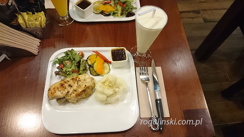 Restauracja oferuje bardzo szeroką gamę dań i przekąsek. Nazwa lokalu mogłaby sugerować, że jest to piekarnia (ang. bakery), jednak można tutaj również zamówić lunch lub danie obiadowe. W „French Bakery” możemy znaleźć różnego rodzaju shaki owocowe, świeżo wyciskane soki oraz przekąski. Ja wybrałem się tam w porze obiadowej i zdecydowałem się na kurczaka podanego z purée ziemniaczanym, z dodatkiem sosu grzybowego oraz sałatką. Jako napój zamówiłem świeży sok pomarańczowy oraz shake bananowy.