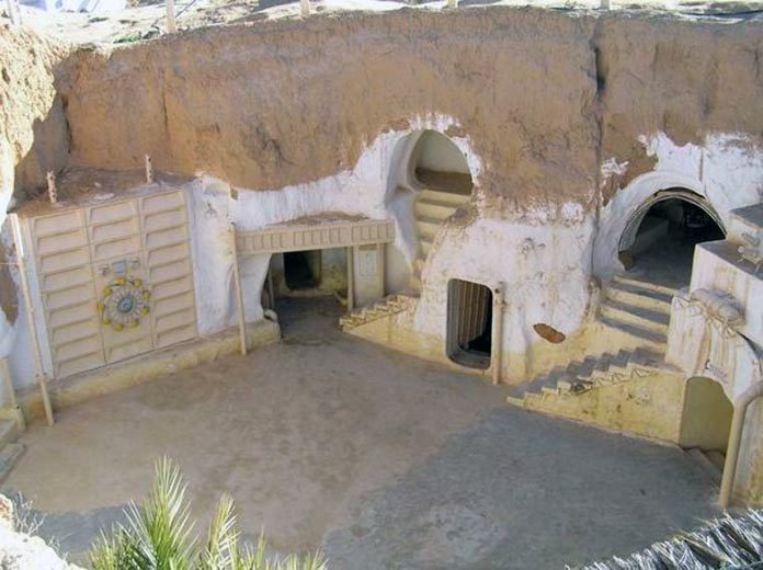 Dom Luke’a Skywalkera z „Nowej Nadziei” to całkowicie inne spojrzenie na futurystyczne aranżacje. Pustynia, która otacza niewielkie i wyłaniające się z gorącego piasku kopuły, skrywa wnętrza wypełnione klasyczną bielą i geometrycznymi kształtami. Nagie chropowate ściany pozbawione są jakichkolwiek ozdób, a jedynym przełamaniem monochromatycznej konwencji jest „niedomalowana” powierzchnia sufitu, ukazująca oryginalny ornament.