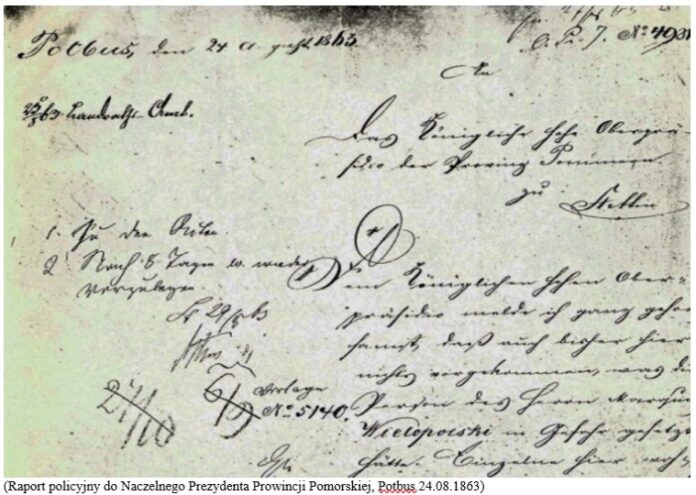 Królewskiemu wysokiemu Prezydium Naczelnemu melduję najposłuszniej, że także dotąd nie zaszło nic, co zagrażałoby osobie pana margrabiego Wielopolskiego. Pojedyncze mieszkające tutaj polskie rodziny to kuracjusze i nie mogę tychże w żaden sposób podejrzewać. W przeszłym tygodniu, przed piętnastym, ukazała się tu wiele razy pewna osoba, która polskiemu narodowi przynależy i przez wygląd swój zewnętrzny do tego mnie skłoniła, żem ją o cel tutaj bytności i o jakieś papiery legitymacyjne spytał. Te ostatnie oznaczały inspektora gospodarczego nazwiskiem Gregor Karpiński i od jakiegoś czasu bez zajęcia. Jego papiery, choć nie całkiem dostateczne, były jednakoż do podróży w kraju przy odpowiednich środkach wystarczające; wiózł o przy sobie circa 30 talarów Rzeszy, i w ogóle już drugiego dnia chciał Rügen opuścić. Karpiński, gdy ujrzał się naprzeciw urzędnika policji, nie wpadł w najmniejsze zakłopotanie, lecz potrafił bardzo zręcznie ukryć je prze śmiałe i pewne odpowiadanie w łamanej niemczyźnie. Kiedym już wobec Karpińskiego żadnej nieufności nie miał, to nie miałem powodu bezpośrednio go podejrzewać i puściłem go. Po minięciu około trzech dni, podczas którego to czasu dwa dni nieustannie towarzyszyłem JW. Margrabiemu na wycieczce do Stubbenkammern, Karpiński pokazał się znowu – nie ma on, jak sądzę, tu w Potbus stałej stancji – natychmiast dałem mu znak, żeby zbliżył się do mnie, on jednak nie przyszedł lecz tym razem rzucił się do ucieczki i zniknął w nieodległym lesie. Przez to zachowanie wymieniony uczynił się silnie podejrzanym, co mnie też potem skłoniło do wszczęcia poszukiwań celem jego schwytania, które tymczasem pozostały bez skutku. Samego margrabiego przestrzegłem przed K. informując o rysopisie tegoż, a on podzielił się ze mną niniejszym, że K. może mieć związek z listownym doniesieniem, które doszło doń niedawno z Krakowa, iż 21 sierpnia ma być zastrzelony, i dlatego zażywać będzie największej ostrożności. Stosownie do tego na 21 sierpnia Jaśnie Pan landrat von Platen auf Bergen, któremu o tem natychmiast służbowo doniosłem, przedsięwziąć kazał odpowiednie środki ku bezpieczeństwu Jaśnie Wielmożnego margrabiego, względnie ujęcie Karpińskiego. Dzień ten jednak przeszedł bez niczego nowego dla margrabiego i więcej jeszcze: dla tegoż bardziej strachliwej pani małżonki był też dzień bardzo ciężki. Poszukiwanie K. ciągnie się dalej i ja sam na wypadki te, zgodnie z funkcją moją tutaj tym bardziej najpełniejszą zwrócę uwagę, że dla K., jeśli zlecono mu może jakąś misję na Rügen, lesisty i mocno pofałdowany teren wokół Potbus dałby okazję najpewniejszą.