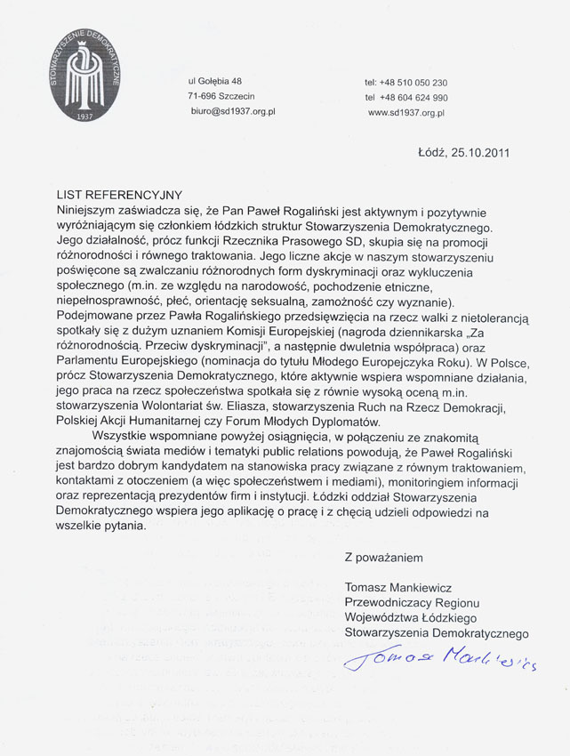 Łódź, 25.10.2011LIST REFERENCYJNYNiniejszym zaświadcza się, że Pan Paweł Rogaliński jest aktywnym i pozytywnie wyróżniającym się członkiem łódzkich struktur Stowarzyszenia Demokratycznego.Jego działalność, prócz funkcji Rzecznika Prasowego SD, skupia się na promocji różnorodności i równego traktowania. Jego liczne akcje w naszym stowarzyszeniu poświęcone są zwalczaniu różnorodnych form dyskryminacji oraz wykluczenia społecznego (m.in. ze względu na narodowość, pochodzenie etniczne, niepełnosprawność, płeć, orientację seksualną, zamożność czy wyznanie).Podejmowane przez Pawła Rogalińskiego przedsięwzięcia na rzecz walki z nietolerancją spotkały się z dużym uznaniem Komisji Europejskiej (nagroda dziennikarska „Za różnorodnością. Przeciw dyskryminacji”, a następnie dwuletnia współpraca) oraz Parlamentu Europejskiego (nominacja do tytułu Młodego Europejczyka Roku). W Polsce, prócz Stowarzyszenia Demokratycznego, które aktywnie wspiera wspomniane działania, jego praca na rzecz społeczeństwa spotkała się z równie wysoką oceną m.in. stowarzyszenia Wolontariat św. Eliasza, stowarzyszenia Ruch na Rzecz Demokracji, Polskiej Akcji Humanitarnej czy Forum Młodych Dyplomatów.Wszystkie wspomniane powyżej osiągnięcia, w połączeniu ze znakomitą znajomością świata mediów i tematyki public relations powodują, że Paweł Rogaliński jest bardzo dobrym kandydatem na stanowiska pracy związane z równym traktowaniem, kontaktami z otoczeniem (a więc społeczeństwem i mediami), monitoringiem informacji oraz reprezentacją prezydentów firm i instytucji. Łódzki oddział Stowarzyszenia Demokratycznego wspiera jego aplikację o pracę i z chęcią udzieli odpowiedzi na wszelkie pytania.Z poważaniemTomasz Mankiewicz