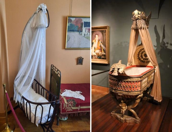 Dwa imiona oseska to Napoleon Franz (drugie imię ku czci austriackiego wspomnianego wyżej dziadka). Ma do dyspozycji kołyskę, a raczej łóżeczko (nie można tej kolebki kołysać), które do dzisiaj corocznie oglądają miliony turystów z całego globu. Ta cesarska kolebka różni się diametralnie od tej z Ajaccio. Tam dominuje prostota. A tu w Wiedniu? Zużyto w Paryżu na nią 280 kg srebra, oprawiono ją szlachetnymi kamieniami. Drewno (najdroższe gatunki) stało się dziełem sztuki, mebelkiem godnym podziwu i milionów zdjęć. Cały zespół stolarzy-mistrzów trudził się dla cesarza. Synek-bobas w dniu narodzin otrzymał tytuł: „król Rzymu”. O to zadbał ojciec, cesarz Francuzów, Napoleon. Jako sygnał dominacji nad Tybrem oraz pokonania w przyszłości niepokornych papieży. Francja ponad wszystko! Pokona wszystkich. To pewne.