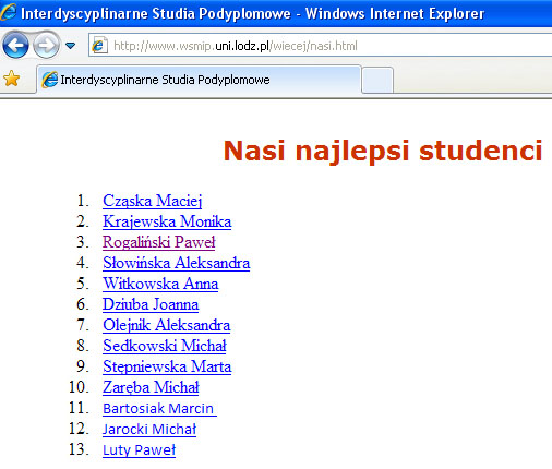 Grupę najlepszych na Wydziale Studiów Międzynarodowych i Politologicznych UŁ wybrały władze tej jednostki. Lista, która ukazała się na prawym pasku na witrynie www.wsmip.uni.lodz.pl obejmuje 13 nazwisk, w tym moje ( http://www.wsmip.uni.lodz.pl/pdf/najlepsi/ROGALINSKI%20Pawel_Najlepsi.pdf ). Chciałbym bardzo podziękować za uznanie. Poniżej zamieszczam treść informacji umieszczonej na stronie wydziału.