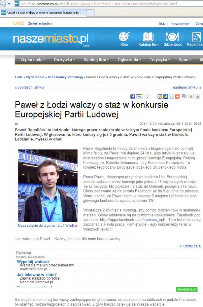NaszeMiasto.pl: "Paweł z Łodzi walczy o staż w konkursie Europejskiej Partii Ludowej"