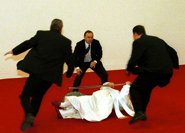 Maurizio Cattelan – światowej sławy włoski rzeźbiarz i twórca instalacji artystycznych, ustawił w bramie jednej z kamienic na terenie dawnego żydowskiego getta w Warszawie, klęcząca figurę Hitlera w geście modlitwy. Był też autorem wystawionej wcześniej w Zachęcie rzeźby Jana Pawła II przygniecionego meteorytem. Figura modlącego się, klęczącego Hitlera została przyjęta źle (Hitler nie ma prawa być tematem sztuki), a papieża przygniecionego meteorytem – postanowiło uwolnić od przygniatającego go kamienia dwoje posłów ZChN, uszkadzając dzieło podczas „akcji ratowniczej”.