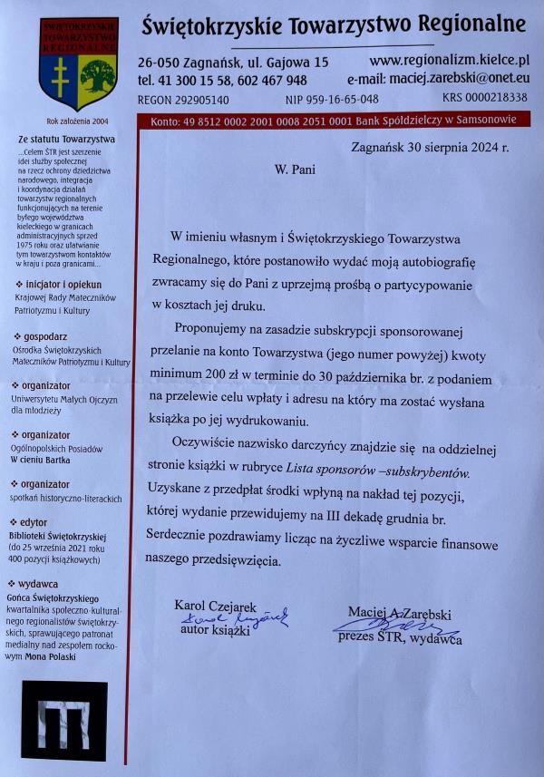 załączam swoją prośbę o współfinansowanie mojej autobiografii, której wydanie książkowe (dotychczas ukazującej się w internetowym „Przeglądzie Dziennikarskim”) zaproponowało mi Świętokrzyskie Towarzystwo Regionalne na czele z jego prezesem dr. Maciejem Zarębskim.