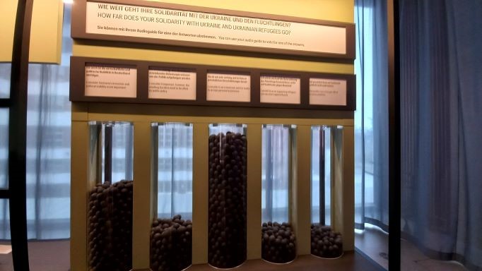 Przed wejściem na teren wystawy stoją przezroczyste kolumny (pojemniki), w których znajdują się pojedyncze elementy (kulki), będące odpowiednikami oddanych głosów. Nad każdą z kolumn – w języku niemieckim i angielskim – wpisano pytanie o nasz osobisty stosunek do problematyki ukraińskich uchodźców.