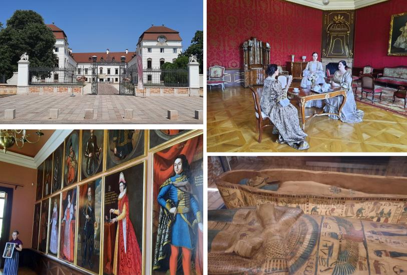 Pierwszą osobliwością wizyty w Pápa w pałacu Esterházy jest to, że trzy przebrane panie w barokowych szatach, w krynolinach i perukach tańczą, śpiewają, słuchają barokowej muzyki, delektując się herbatą oraz szampanem w kolejnych salach i komnatach! Noszą kilogramy atłasowych szat w takim upale! Wyprzedzają nas o pół minuty w zwiedzaniu pokojów. Trzy barokowe gracje uśmiechają się tajemniczo do naszej grupki, kilku gości, sunących po dywanach przez nie kończące się sale. My turyści, okazujemy wdzięczność oklaskami.