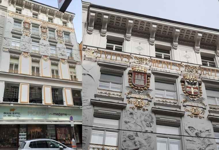 A 100 m od niej stanąłem na wąskim trotuarze, gdyż (vide tytuł) przy „Targu Mięsnym nr 7“ zachwyciła mnie fasada tego kilkupiętrowego domu. W Wiedniu można w wielu miejscach oglądać takie fasady, ale ta rzuca się w oczy „wypieszczeniem“ ornamentycyjnym. Stoję przed nią na przeciwległym chodniku, aby móc lepiej ją obejrzeć. Ulica nie należy do tych najszerszych i trzeba zadzierać głowę, by ten dom systematycznie i dokładnie, step by step, kontemplacyjnie obejrzeć. Szukam najlepszego punktu topograficznego, by globalnie oglądnąć to piękno.