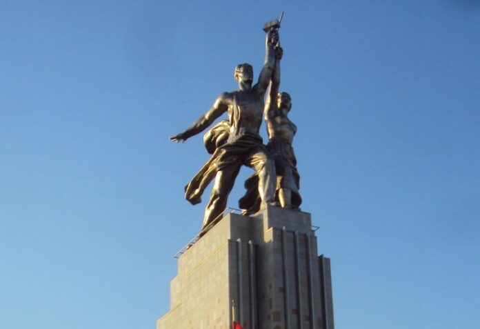 Tu, nad rzeką Moskwą, ustawiono pomnik owego robotnika w duecie ze skolektywizowaną oczywiście chłopką w najodpowiedniejszym miejscu. Towarzysz Stalin kazał zorganizować na olbrzymich terenach w stolicy Wystawę Rolniczą, którą sam otworzył 1 sierpnia 1939 roku. Tam ustawiono przytransportowany z powrotem z Francji pomnik. Logiczne. Potężnego kalibru dzieło, imponujące wzrokowo zaczęło być sławne – to symbol sowieckiej sztuki, udana rzeźba, powabnie ukazująca młodą parę zakochaną mniej w sobie, lecz bardziej w budowę jedynie słusznego systemu politycznego. Połączywszy swe siły – świetny symbol! – kobiety i mężczyzni z ZSRR, pokonają wszelkie trudności oraz zapaści dzięki słusznym uchwałom komitetu centralnego jedynej w kraju partii! Dla niej będą płodzić następne pokolenia.