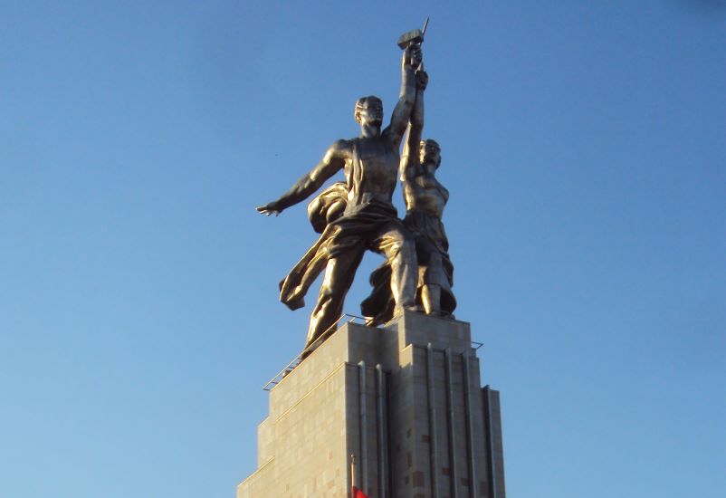 Stał przed pawilonem ZSRR a paryskie wschodzące słońce oświetlało dwa ciała, symbolizujące prężny rozwój przemysłu (robotnik z młotem) oraz rolnictwa (chłopka z kołchozu z sierpem w dłoni). Dwie figury, mimo masywności dzieła, robią wrażenie lekkości, wzlotu, młodości oraz energii potrzebnej do nowych zdobyczy komunizmu. Mężczyzna ukazuje doskonałe muskuły, kobieta prężne piersi. Piękne dzieło! Te dwie postaci rwą się harmonijnie do lotu przyszłości, rozbudowania systemu polityczno-gospodarczego wprowadzonego w Rosji od 1917 roku. Zachwyceni Francuzi chcieli kupić ten porywający pomnik, tak im się spodobał. Negocjacje trwały krótko. Towarzysz Stalin, wódz i bóg, powiedział kategorycznie „njet”. Nie ma dyskusji. Mer Paryża skapitulował – bez walki. Monument rozmontowano i z powrotem przewieziono do Moskwy.