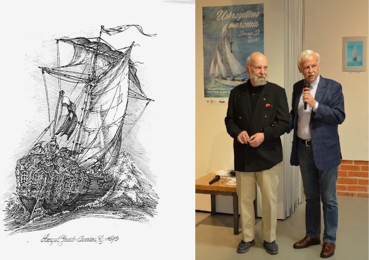 W takich to okolicznościach poznałem Jerzego Tyszkę. Podarował mi wówczas wyszukaną grafikę pięknego galeona pod pełnymi żaglami, holującego małą szalupę, nie wiadomo dlaczego. Zapomnieli, że coś ciągną za rufą? Morze jest przecież wzburzone. Na górnym kasztelu pojawia się sylwetka oficera, który chyba przeklina pod nosem, może po angielsku, hiszpańsku albo po rosyjsku; za daleko więc nie słychać. Dedykacja na odwrocie jest prostsza i bardziej zrozumiała. A choć tyle już lat się znamy, jakoś dotąd nie zapytałem go skąd tam za żaglowcem owa szalupa na sznurku. Jeszcze o wiele innych spraw nie zapytałem Jurka. A przecież należy.