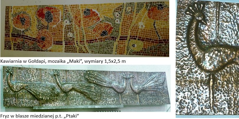 Zaprojektowaną przez siebie mozaikę ścienną musiałam wykonać osobiście, włącznie z  zamontowaniem jej na ścianie. Trzeba było zdobyć odpowiedni materiał, zadbać o określoną kolorystykę  szkła, ułożyć i przykleić na barwnym podłożu szklane elementy tak, jak wskazywał  projekt. Dodatkową trudność stwarzała konieczność przycinania materiału, jeśli np. zabrakło kwadracików w potrzebnym kolorze. Po ułożeniu należało zabezpieczyć pracę, unieruchomić  poprzyklejane barwne kawałeczki i przewieźć całość na miejsce montażu, które było dosyć odległe. Mozaika miała zawisnąć w miejskiej kawiarni w Gołdapi. Było oczywiście sporo jeszcze innych procedur podczas wykonywania tej pracy. Na miejscu trzeba było zamontować całość w ścianie, uprzednio ją przygotowując. To wszystko było dla mnie nowym  doświadczeniem, obfitującym po drodze w drobne katastrofy i przeszkody.  Udawało się pokonywać je dzięki mojemu mężowi, który dzielnie mnie wspierał. Mozaika zawisła wreszcie na ścianie kawiarni i choć miała zapewne parę słabych punktów, była oczywiście dla mnie źródłem radości i dumy…